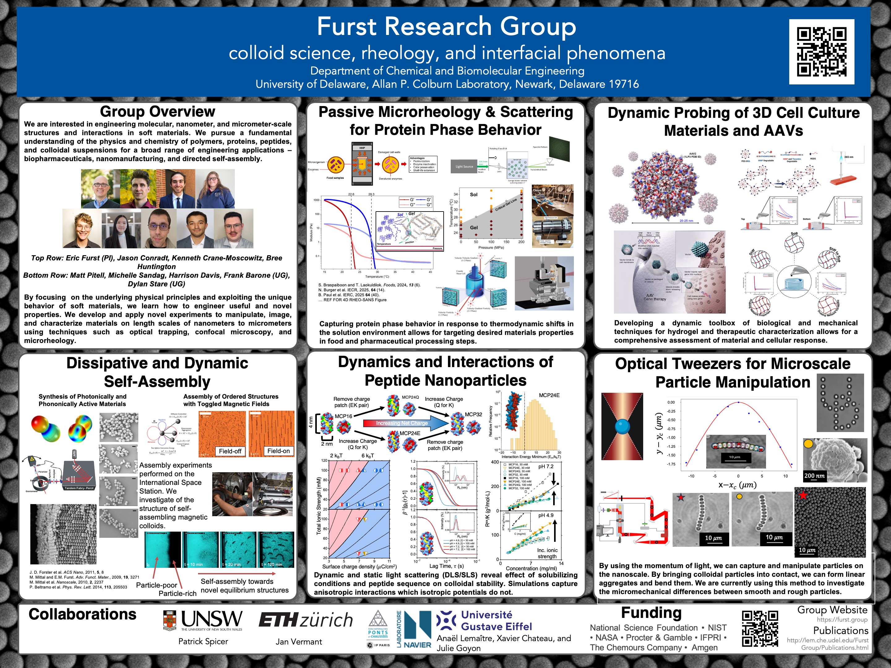 - Matthew G. Langenstein, Kenneth Crane-Moscowitz, James M. Brennan, Christopher J. Kloxin, Eric M. Furst, Darrin J. Pochan, “Sequential growth of quantized peptide brushes on colloidal gold,” Langmuir, 41, 3130– 3139 (2025). doi: 10.1021/acs.langmuir.4c03698